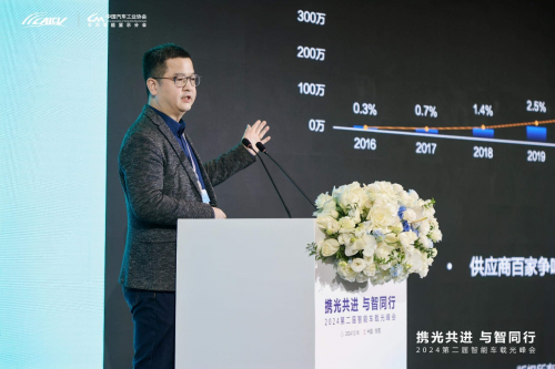 在主題演講環節,華為智能車載光領域總裁陳雙寶帶來了《攜光共進,與智同行》的主題演講。陳雙寶表示,2024年是智駕的元年,人們對自己看到、感覺到的東西更容易產生信任感,希望用光學的技術改變交互的體驗。他提到,華為未來將圍繞幾個方向解決產業發展過程中的難點,包括與消費者、駕駛員和路邊行人做交互,推動更多法規的檢索等。同時,他也呼吁行業各方加強合作,推動技術創新和市場應用的轉化,形成良性的商業循環和閉環,促進整個產業的健康發展。