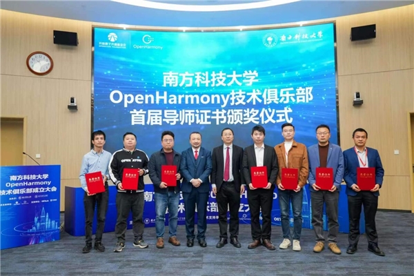 會中,陳海波和沈平共同為九位高校導師:張青峰、嘉有為、張鋒巍、張進、唐茗、吳光、徐琳琳、唐博、陳亮名,以及九位企業導師:常瑞華、楊軒、唐松龍、連志安、黃鴻波、吳興、石偉、程勝春、張元方頒發了南方科技大學OpenHarmony技術俱樂部首屆導師證書。
