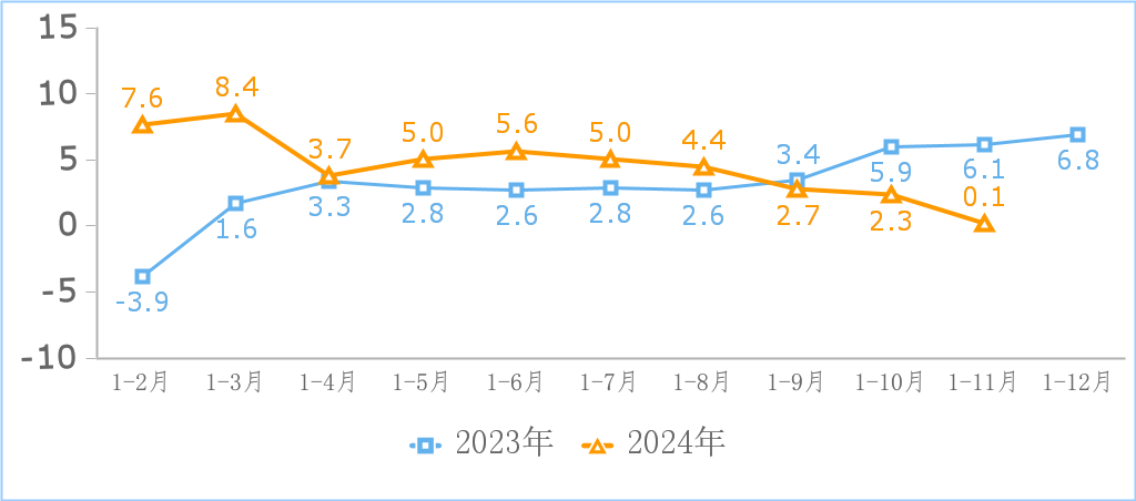 互聯網業務收入增長放緩。1-11月,我國規模以上互聯網和相關服務企業(以下簡稱互聯網企業)完成互聯網業務收入16186億元,同比增長0.1%,增速較1-10月回落2.2個百分點。