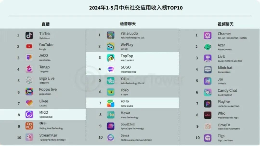 社交產品矩陣中,根據已知數據,直播社交平臺MICO、游戲社交平臺TopTop、陪伴社交平臺SUGO、語音社交平臺YoHo這四大核心產品均登上由移動應用數據分析平臺SensorTower發布的“2024年1-5月中東社交應用收入榜TOP10”。