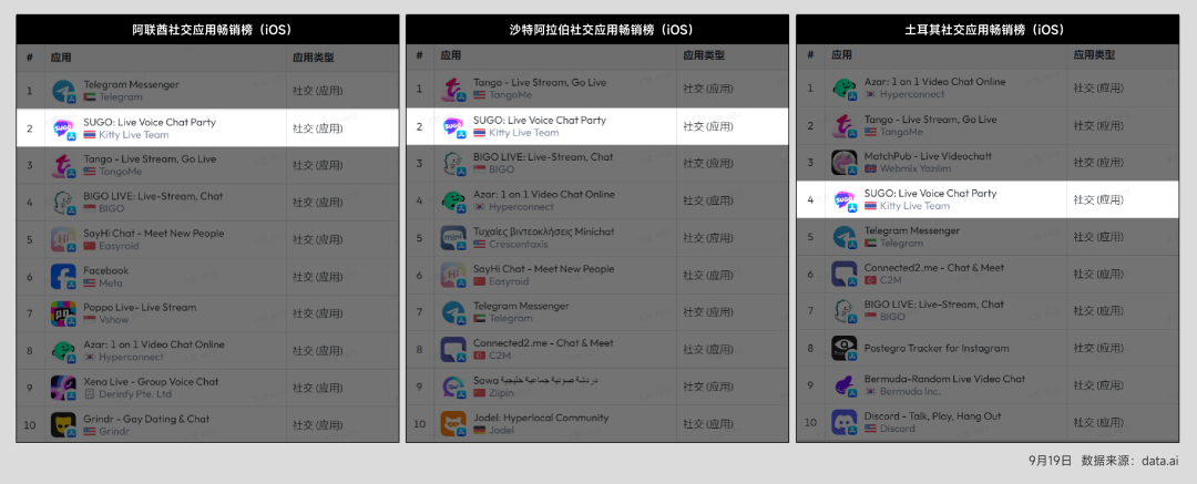 其中,后發產品中,SUGO基于深度模型的社交推薦,采用用戶精準分析的商業化運營模式,去年7月一舉成為單月流水規模最高的產品,全年收入增超2倍。據data.ai,2024年SUGO在沙特阿拉伯、土耳其、阿聯酋等中東國家的社交應用暢銷排行榜中穩居前列。