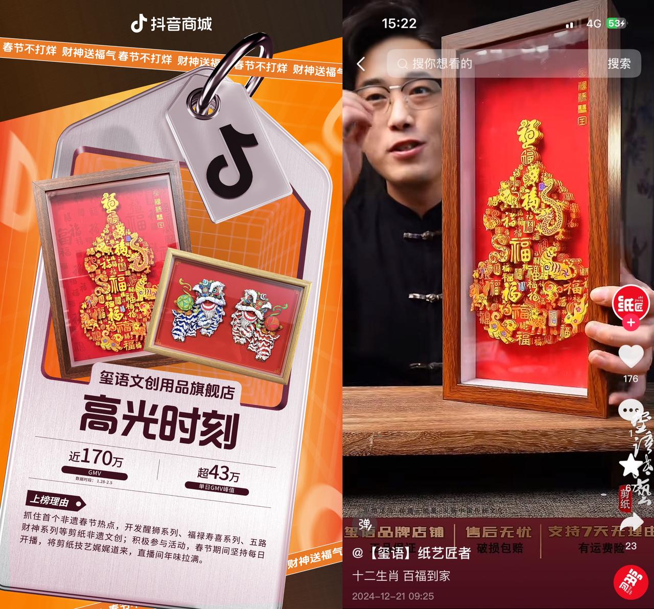 中國(guó)人把追尋“年味”刻進(jìn)DNA,體驗(yàn)非遺文化成為最具年味的存在。2025年春節(jié)是首個(gè)“非遺版”中國(guó)春節(jié),主打國(guó)潮文創(chuàng)、非遺文創(chuàng)的店鋪獲得廣大消費(fèi)者追捧。曾獲得省級(jí)文創(chuàng)大賽金獎(jiǎng)的非遺頭部商家璽語(yǔ)文創(chuàng)用品旗艦店,堅(jiān)持春節(jié)每天開(kāi)播,生動(dòng)有趣地介紹非遺剪紙技藝,堪稱“年味擔(dān)當(dāng)”。其針對(duì)春節(jié)開(kāi)發(fā)的醒獅系列、福祿壽喜系列、五路財(cái)神系列等多款高端剪紙藝術(shù)非遺文創(chuàng)深受用戶喜愛(ài),銷量一路猛增。1月28日-2月5日春節(jié)大促期間店鋪營(yíng)業(yè)額近170萬(wàn)元,單日峰值超43萬(wàn)元。