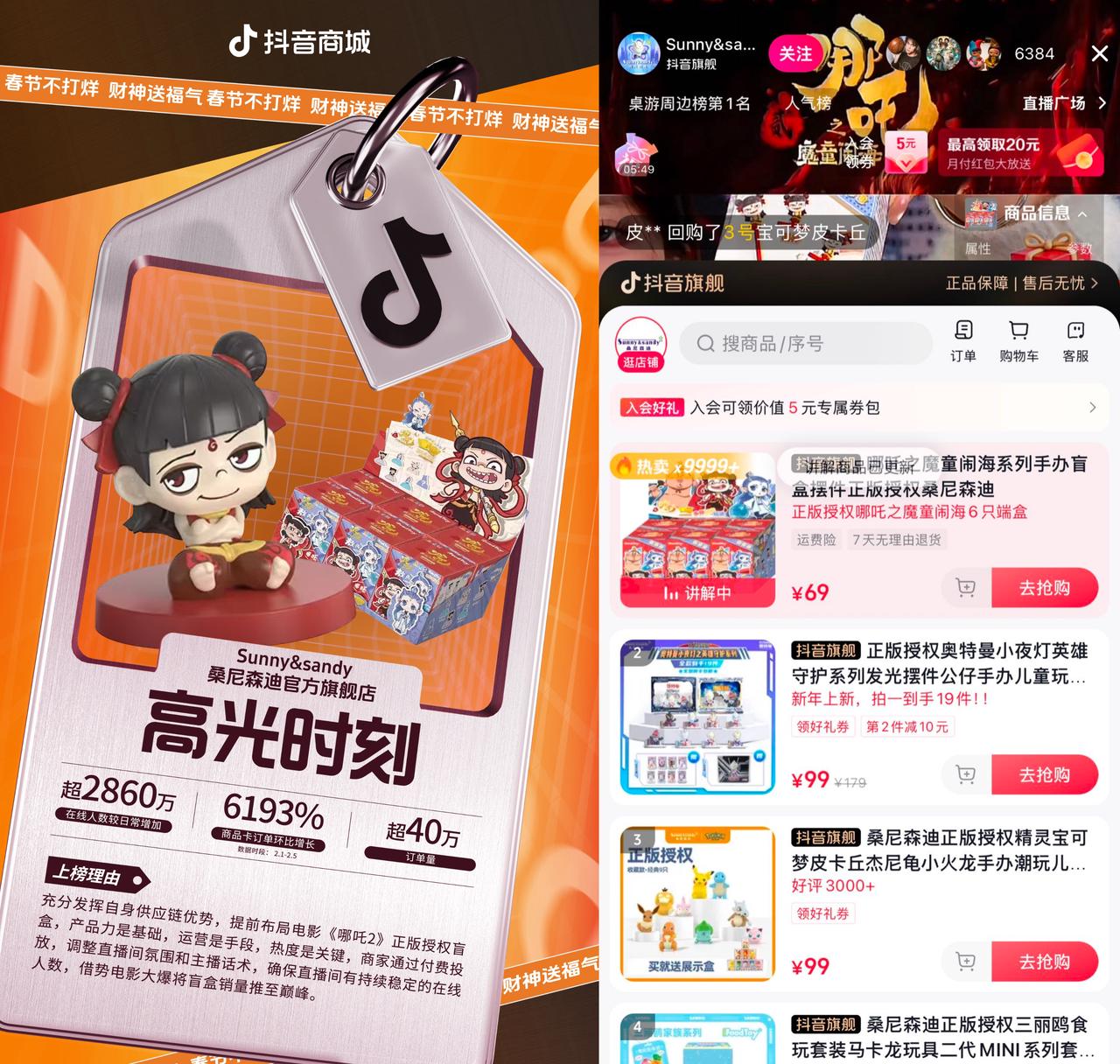 將產(chǎn)品與春節(jié)熱門(mén)話題深度捆綁,能夠達(dá)到1+1>2的營(yíng)銷效果,不少抖音電商商家深諳此道。電影《哪吒2》的火爆直接帶動(dòng)了衍生品銷量,抖音商家或提前布局、或火速跟進(jìn),接住這波“潑天富貴”。Sunny&sandy桑尼森迪官方旗艦店充分發(fā)揮自身供應(yīng)鏈優(yōu)勢(shì),提前布局電影《哪吒2》正版授權(quán)盲盒,借勢(shì)電影大爆將盲盒銷量推至巔峰。春節(jié)期間三位主播不停播,輪番上陣cos電影角色,將粉絲熱情持續(xù)拉滿。最終店鋪通過(guò)活躍直播氛圍、付費(fèi)投放、產(chǎn)品力等綜合競(jìng)爭(zhēng)力的加持,吸引了源源不斷的購(gòu)買力,2月1日-5日成交超2860萬(wàn)元,環(huán)比增長(zhǎng)6193%。與經(jīng)典IP深度融合的小小盲盒成為店鋪活招牌。