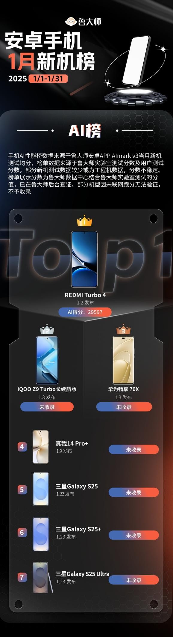 三星Galaxy S25系列在驍龍8至尊版for Galaxy強大AI算力支撐下,按理來說斬獲1月AI性能榜冠軍應該板上釘釘,遺憾的是魯大師后臺未曾收錄到該機型的AI跑分,期待Galaxy AI后續的精彩表現。而本月僅查詢到REDMI Turbo 4唯一一款新機的AI跑分成績。