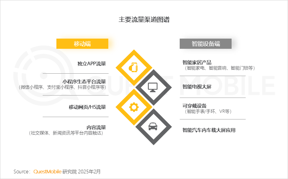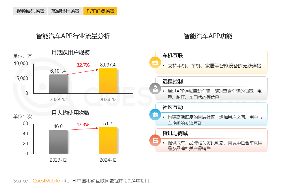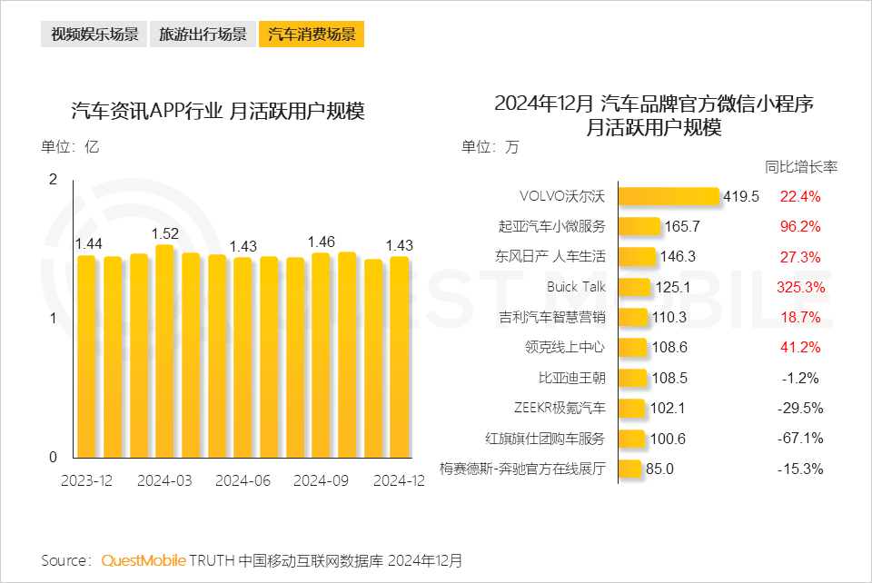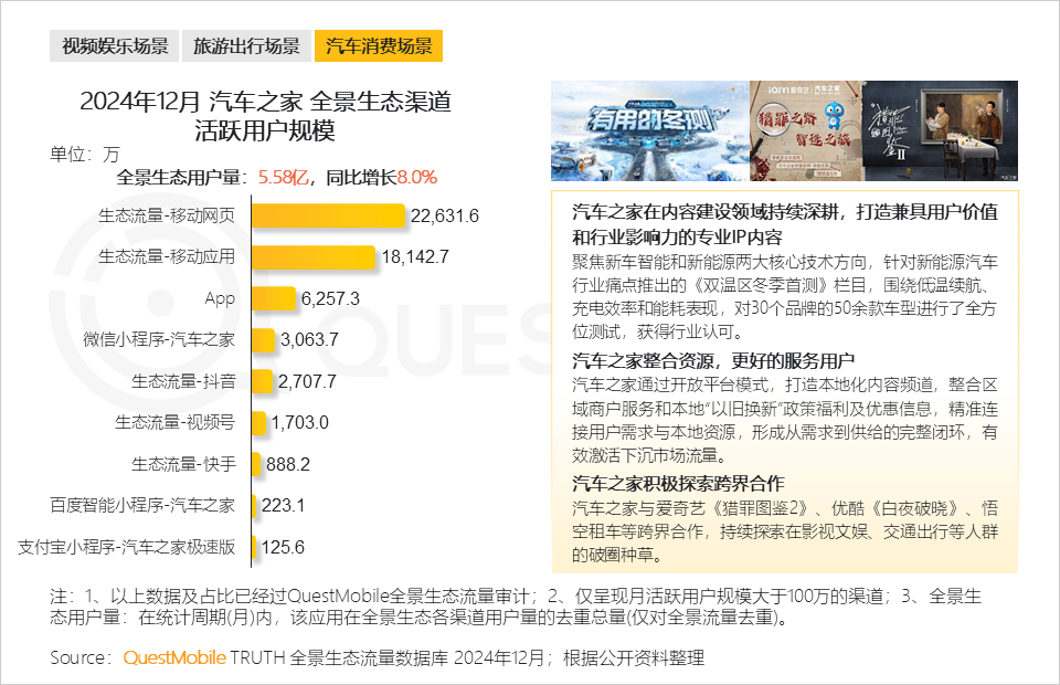 2024年可謂是“智能元年”,QuestMobile數據顯示,截止到12月份,在APP和微信小程序提供了穩定的12.57億、9.36億月活用戶基礎上,由于AI能力的持續爆發,以及數字化對用戶習慣的持續改變,智能家居、智能汽車、可穿戴設備等迎來了全面的流量增長,不僅串聯起了更多消費場景,還構建起了“OTT+汽車”等多智能場景終端的“數字營銷大生態”!