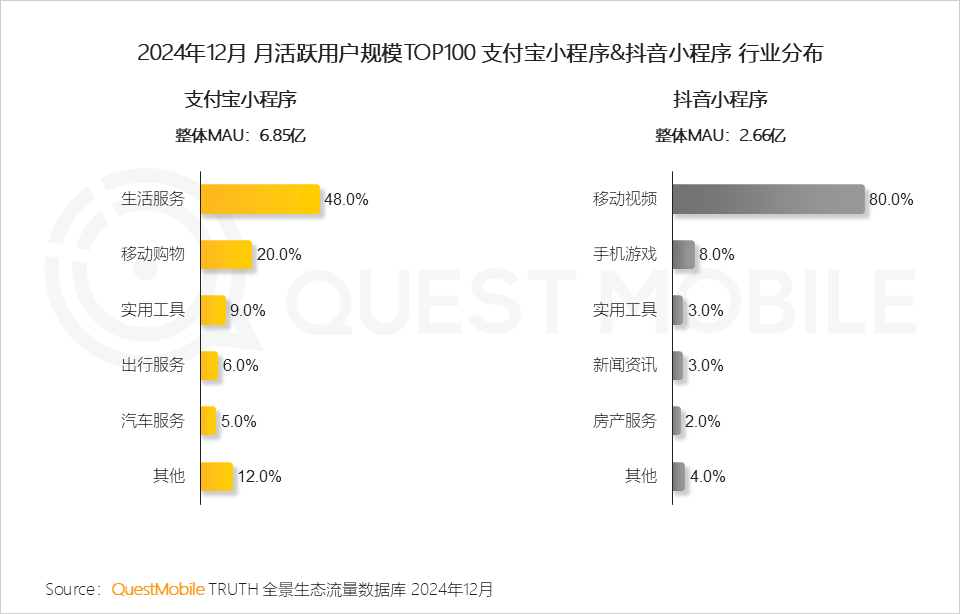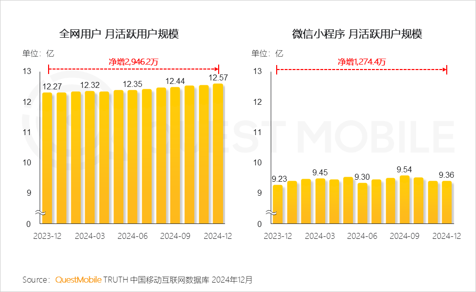 QuestMobile數據顯示,2024年12月,全網流量已達到12.57億,微信小程序端整體流量達到9.36億,較去年同期仍有小幅增長。
