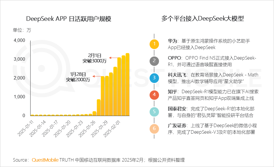 6、春節期間,DeepSeek引發社交媒體上的大討論,2月1日其APP端日活用戶已突破3000萬,高效能和低成本應用模式吸引金融機構、科技公司、手機廠商等各企業積極接入