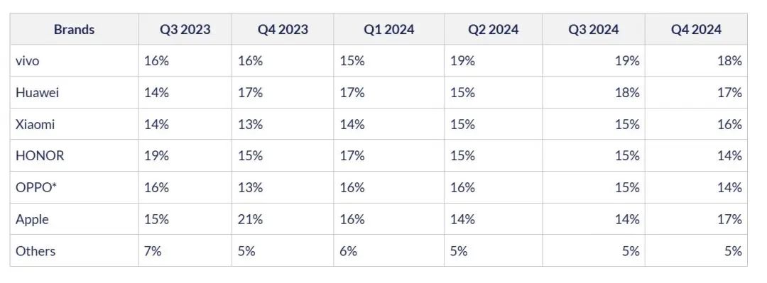 小米以 16% 的市場份額位列第四,主要得益于旗艦 Mi 15 系列的熱銷。該品牌在今年的高端化方面取得了顯著進展。