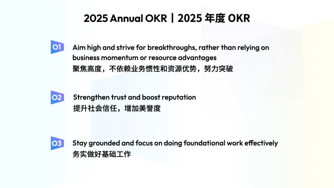 梁汝波分享了自己在 2025 年的 OKR,其中第一個 O(目標)就是“聚焦高度,不依賴慣性和資源優勢,努力突破”。