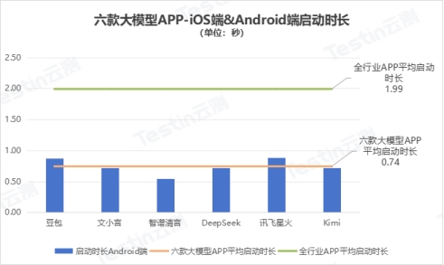 盡管這次測試的幾款大模型APP在兼容性方面存在一些問題,但值得一提的是,六款大模型APP在整體啟動時間指標上表現優異。在Android平臺上,六款APP的平均啟動時間為0.74秒,遠低于行業均值的1.99秒。其中,智譜清言的啟動時間最短,為0.55秒,這可能與大模型APP的安裝包較小、功能相對簡單有關,使得啟動速度得以優化,用戶能在短時間內快速體驗。