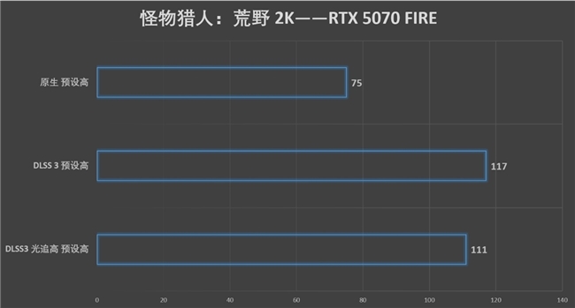 在最新游戲怪物獵人:荒野 Benchmark中,開啟高擋位預(yù)設(shè),在2K分辨率原生畫質(zhì)下,RTX 5070 FIRE能達(dá)到75幀的測試成績,開啟DLSS 3后幀數(shù)可以達(dá)到117幀,開啟光追高擋位的幀數(shù)為111幀,整體在2K的表現(xiàn)下還不錯。