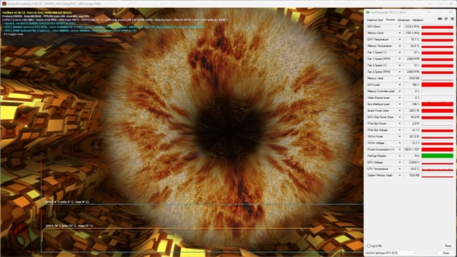 在furmark中進(jìn)行烤機(jī)測試,在1080P測試滿載10分鐘,室溫25度,開啟機(jī)箱側(cè)面板的狀態(tài)下,顯卡溫度達(dá)到70.7°C,核心頻率維持在2362MHz左右,顯卡功耗為247.2W,接近250W。