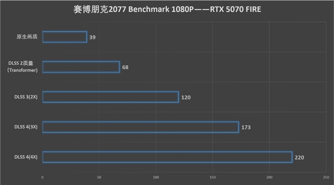 首先是賽博朋克2077,由于游戲畫面至今仍未過時,所以哪怕在1080P下,也是非常吃性能的,并且2077是首批支持DLSS 4的游戲,在這里我們能更清晰的展現(xiàn)出DLSS 4的強(qiáng)大。那么在原生畫質(zhì),特效預(yù)設(shè)全高,開啟光線路徑追蹤,在1080P下原生畫質(zhì)幀數(shù)為39幀,而單單開啟DLSS 2質(zhì)量級別后,幀數(shù)便超過60幀來到68幀,而開啟DLSS 4(4x)(持續(xù)開啟DLSS 2質(zhì)量),幀數(shù)更是達(dá)到質(zhì)的飛躍,漲到220幀,可以說開啟DLSS 4后,幀數(shù)輕松實(shí)現(xiàn)質(zhì)的飛躍。
