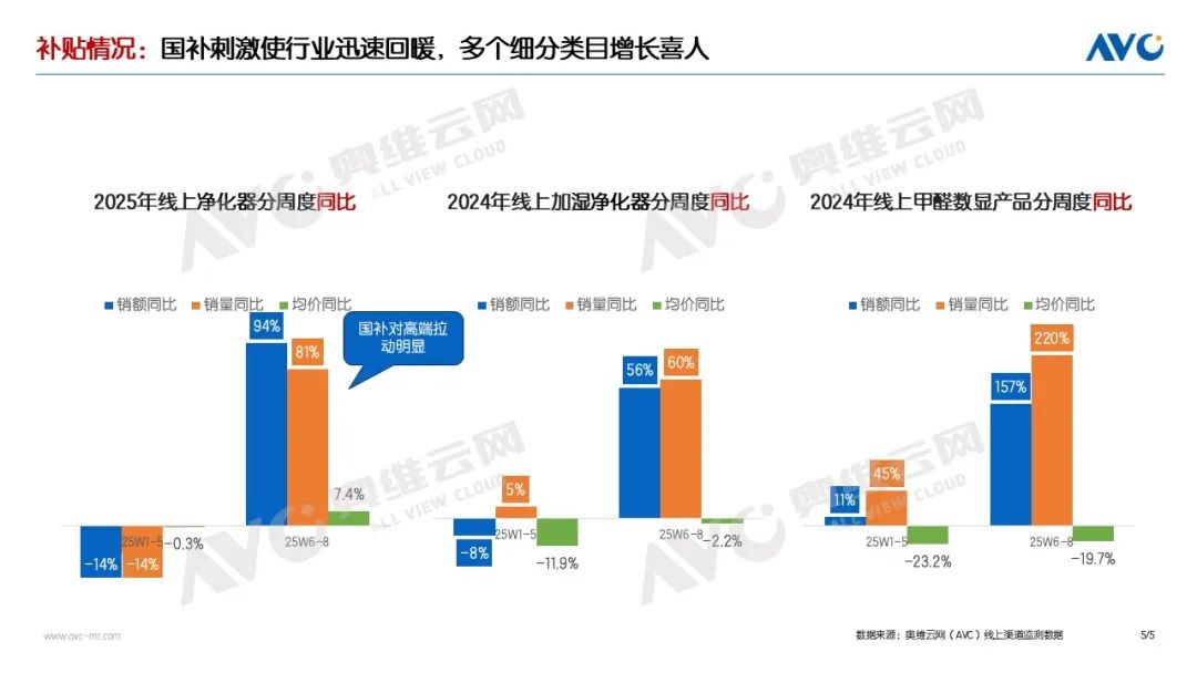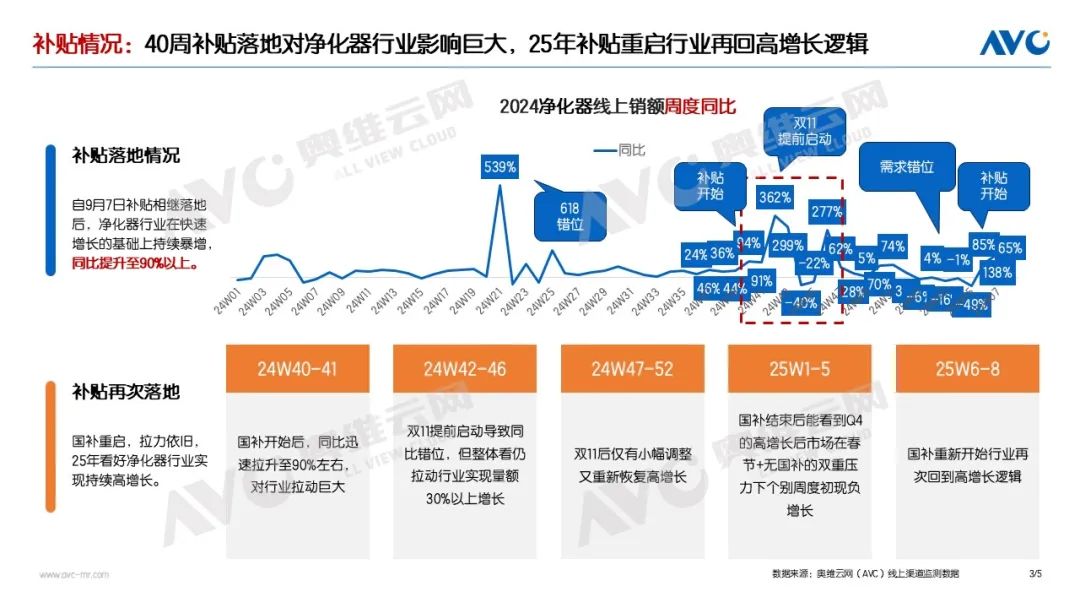 線上補貼從第40周啟動,補貼前的平峰期行業(yè)增幅約在30% - 40%之間;補貼實施后,增幅迅速躍升至90%以上。即便在雙11結(jié)束后,線上增長幅度仍維持在70%以上。2025年第6-8周,補貼重新開啟后,行業(yè)增幅再度快速攀升至80%以上,這充分彰顯了補貼政策對行業(yè)的強大刺激作用。而聚焦大促節(jié)點,盡管同期基數(shù)較高,但雙11期間空氣凈化器依然表現(xiàn)出色,實現(xiàn)了量額30%以上的高速增長。