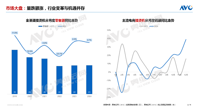 2024年上半年,掛燙機市場仍顯頹勢。奧維云網(wǎng)(AVC)線上監(jiān)測數(shù)據(jù)顯示,2024年前六個月主流電商掛燙機銷售中,銷額同比為正的僅有3月、4月兩個月。但隨著下半年以舊換新政策的開啟,存量市場快速激活。數(shù)據(jù)顯示,去年下半年以來,掛燙機銷額同比持續(xù)攀升,行業(yè)頹勢扭轉(zhuǎn),最終實現(xiàn)了全年規(guī)模的結(jié)構(gòu)性復(fù)蘇。