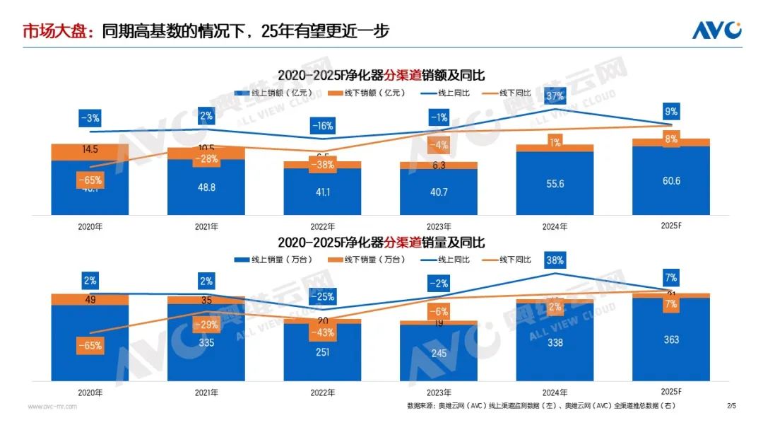 2024年在新需求和國補的共同拉動下,空氣凈化器行業(yè)成功擺脫了多年來的負增長困境,實現(xiàn)了迅速回暖,聚焦2025,隨著國補政策的持續(xù)推行,行業(yè)有望延續(xù)2024年的增長勢頭。奧維云網(wǎng)(AVC)推總預(yù)測數(shù)據(jù)顯示,2025 年全渠道銷額預(yù)計將實現(xiàn)9%的同比正增長,銷量預(yù)計將實現(xiàn)7%。行業(yè)增長主要歸因于以下幾個關(guān)鍵因素:
