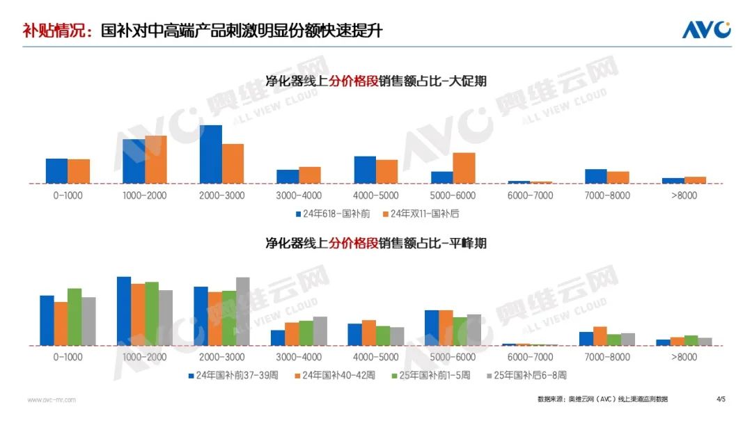 奧維云網(wǎng)(AVC)監(jiān)測數(shù)據(jù)顯示,25W01-08凈水器線上零售額同比增長13%,零售量同比增長12.5%,線下零售額同比增長34.4%,零售量同比增長21.8%,春節(jié)假期和國補政策影響因素下,凈水器市場實現(xiàn)同比高增。從價格段分布來看,25W01-08線上和線下價格段與2024年國補平峰期(不包含2024年雙11)相比,中低端市場價格段份額增長,線上高端市場競爭激烈,線下高端市場保持一定韌性。