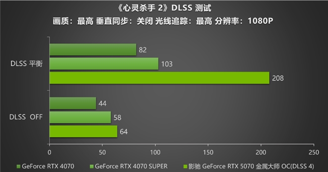 在《心靈殺手2》這款采用重度光線追蹤的次世代游戲,光追效果對傳統光柵化性能的壓榨極為明顯。在1080P分辨率下,影馳 GeForce RTX 5070 金屬大師 OC 憑借自身性能可實現64幀流暢運行的成績,而在開啟DLSS 4技術后,幀數更是達到超過200幀的高分。