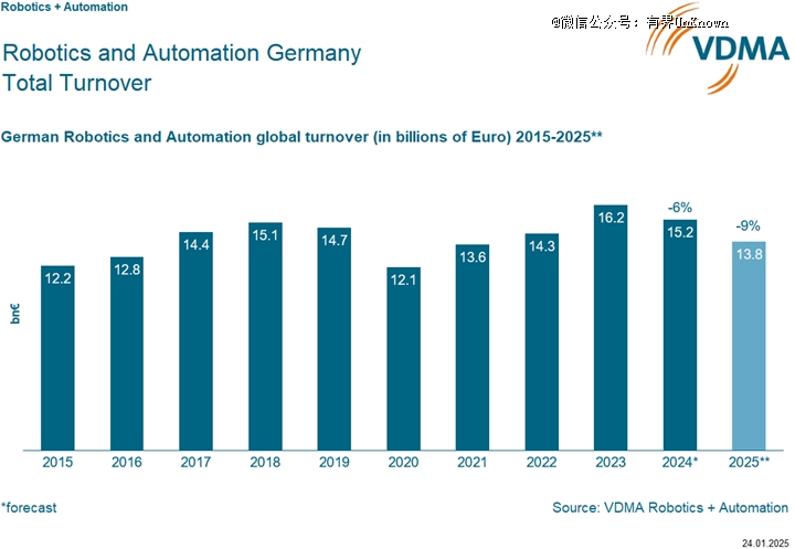 德國機械設備制造業聯合會 (VDMA) 近期的一項預測顯示,2025年,德國機器人和自動化設備銷售額預計將下降9%至138億歐元,而去年的銷售額為152億歐元,下降了6%。