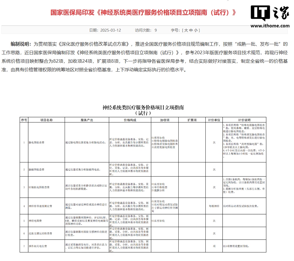 3 月 12 日消息,國家醫(yī)保局今天發(fā)布《神經系統(tǒng)類醫(yī)療服務價格項目立項指南(試行)》。