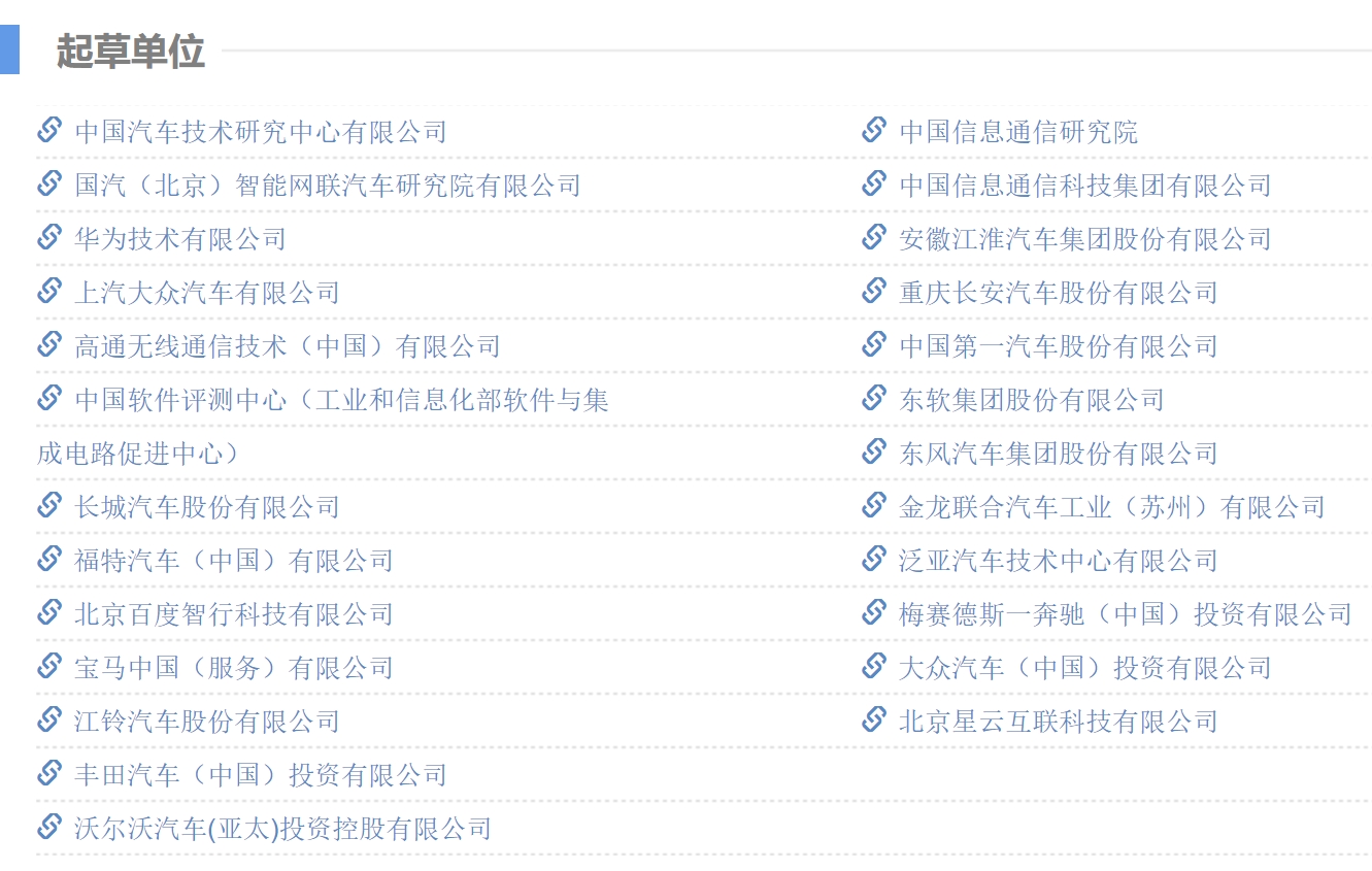 該標準主要起草單位包括中國信通院、華為、中國信科、高通、大眾、長城、福特、百度、寶馬、豐田、沃爾沃、長安、東風、梅賽德斯等。