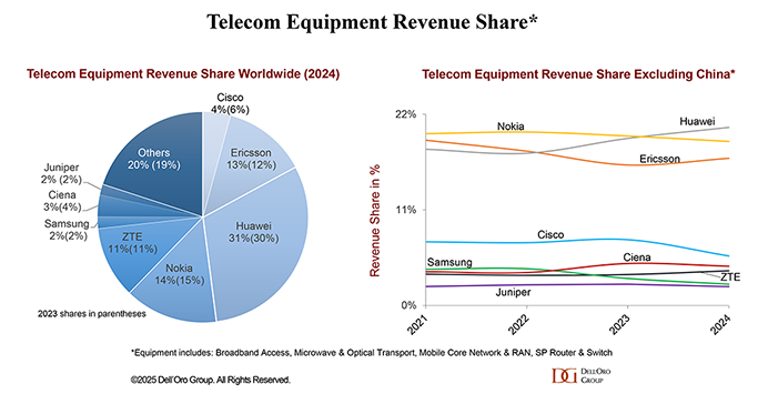 全球供應商排名基本保持不變,但收入份額略有變化,因為華為和愛立信的份額均有所提升。整體市場集中度保持穩定,8家供應商在2024年占全球市場的約80%。