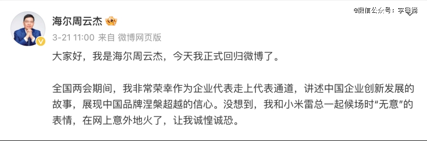 更戲劇性的“帶貨場景”發(fā)生在兩會現(xiàn)場。兩會期間,雷軍熱情和粉絲打招呼,而站在雷軍身后的周云杰露出了一些列略顯無奈且被迫營業(yè)的表情,被網(wǎng)友做成了各種表情包后走紅網(wǎng)絡(luò)。