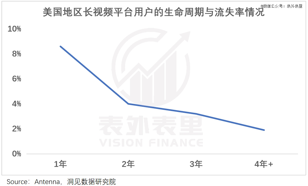 而越懂用戶的口味,長視頻平臺就越能降低用戶流失,沉淀自己的會員。以美國地區長視頻平臺為例,生命周期大于等于4年的會員,流失率顯著低于訂閱1年的會員。
