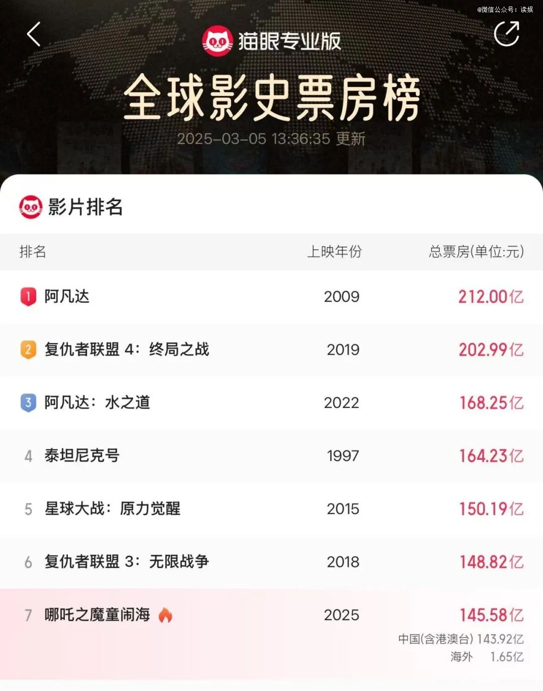 在過去的一個多月時間內,全球票房已超過145億的《哪吒之魔童鬧海》(以下簡稱《哪吒2》)是文娛市場的*熱點。按目前形勢,《哪吒2》仍然有很大概率超過《星球大戰:原力覺醒》排到全球影史第五的位置。