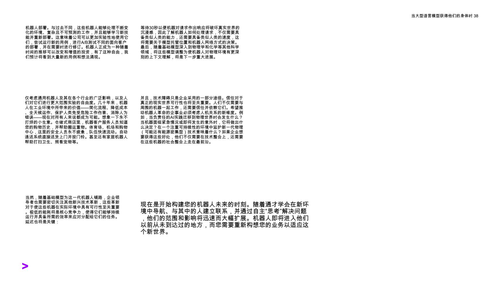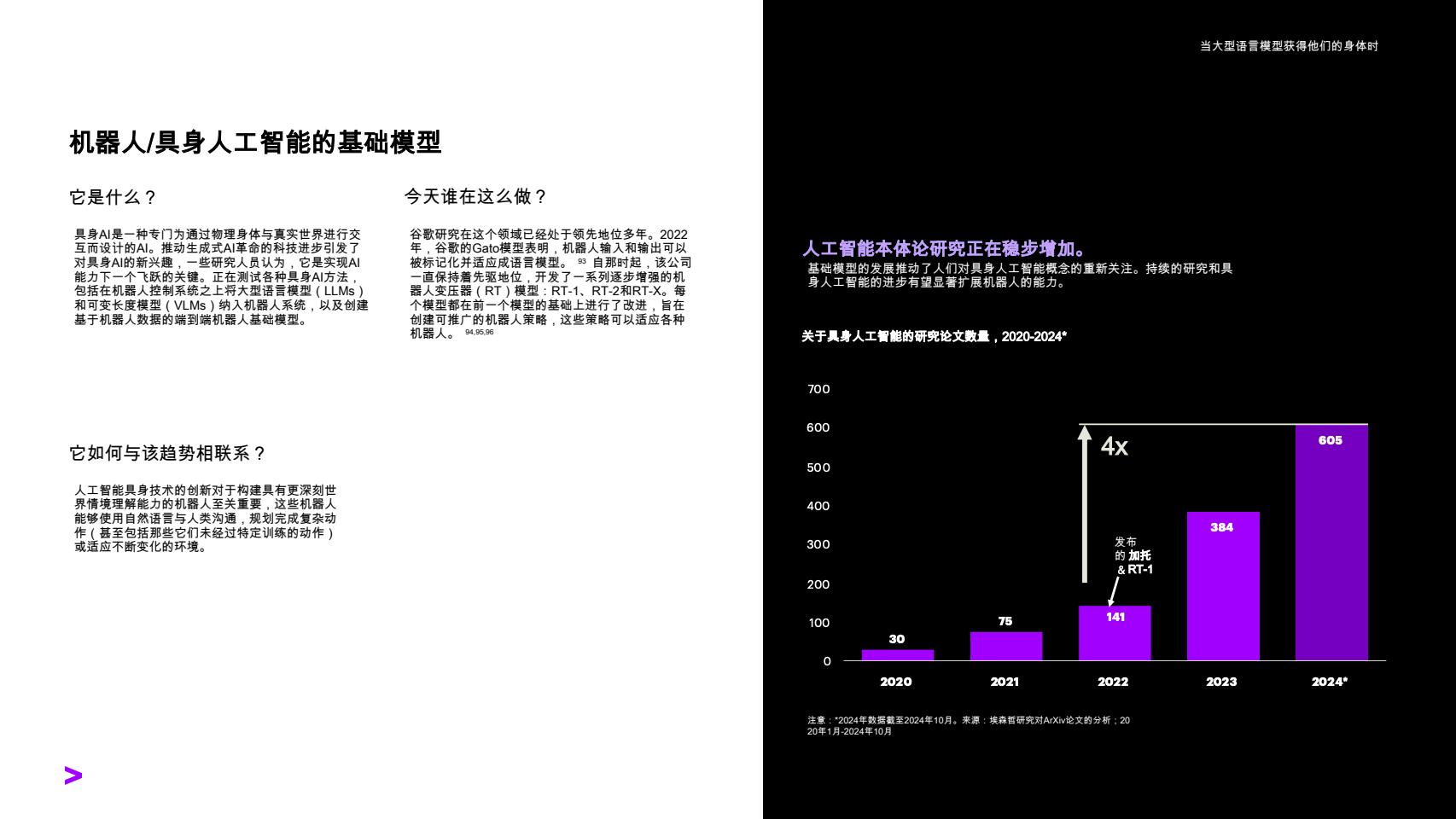物理空間智能化:生成式AI與機器人技術融合,預示著高度自主的通用機器人即將問世,它們能快速學習新任務并與人類員工無縫協作、互學,提升效率與安全性。