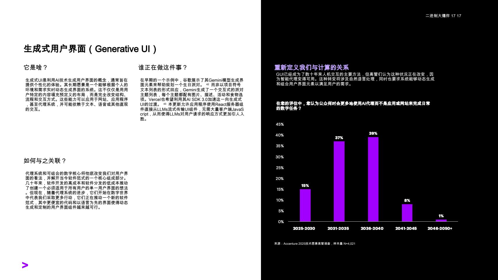 員工接受度:熟悉AI技術的員工對該技術抱有積極看法的比例高出其他員工五倍。核心觀點是:人工智能正進入一個以“自主性”為特征的新發展階段,其不斷學習和自主行動的能力將深刻重塑企業運營乃至整個社會。要成功駕馭這一變革并充分釋放AI的巨大潛力,建立和維護“信任”是不可或缺的基石。企業需要認識到變革的緊迫性,積極擁抱AI,并在技術開發、客戶互動、物理空間應用(機器人)和未來工作模式等關鍵領域進行戰略性布局和重塑,同時必須確保技術戰略與信任戰略的協同推進,并關注人與AI的和諧共生關系。