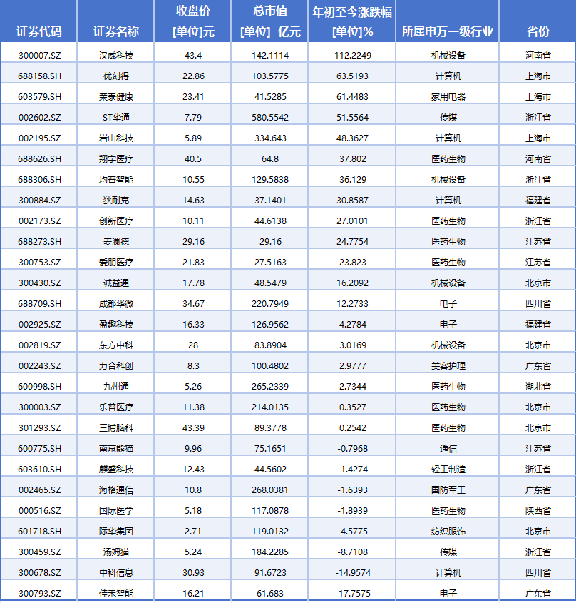 從二級市場表現看,今年以來,漢威科技、優刻得、榮泰健康、ST華通4家上市公司區間漲幅已經超過50%,其中,漢威科技股價漲幅已經高達112.22%。