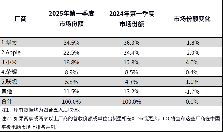 IT之家從報告獲悉,華為、蘋果、小米、榮耀、聯想位列 2025 年一季度中國平板電腦市場出貨量前五。