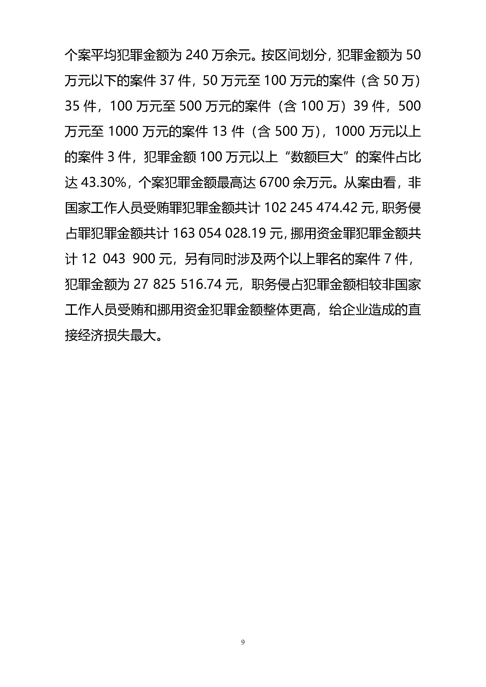 經(jīng)統(tǒng)計,127件案件犯罪金額共計305168919.35元,個案平均犯罪金額為240萬余元。按區(qū)間劃分,犯罪金額為50萬元以下的案件37件,50萬元至100萬元的案件(含50萬)35件,100萬元至500萬元的案件(含100萬)39件,500萬元至1000萬元的案件13件(含500萬),1000萬元以上的案件3件,犯罪金額100萬元以上“數(shù)額巨大”的案件占比達43.30%,個案犯罪金額最高達6700余萬元。從案由看,非國家工作人員受賄罪犯罪金額共計102245474.42元,職務(wù)侵占罪犯罪金額共計163054028.19元,挪用資金罪犯罪金額共計12043900元,另有同時涉及兩個以上罪名的案件7件,犯罪金額為27825516.74元,職務(wù)侵占犯罪金額相較非國家工作人員受賄和挪用資金犯罪金額整體更高,給企業(yè)造成的直接經(jīng)濟損失最大。
