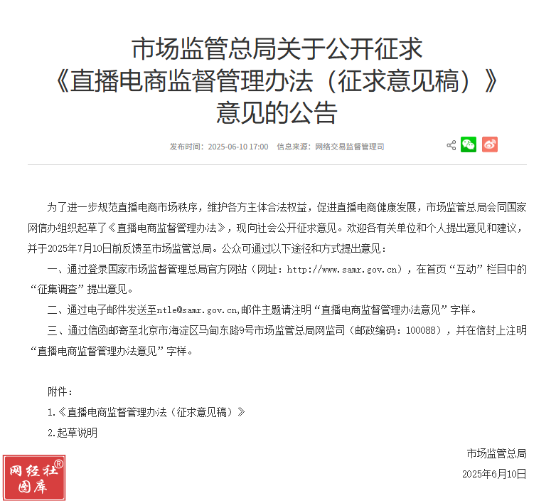 在此背景下,市場監管總局于 2025 年 6 月 10 日發布《直播電商監督管理辦法(征求意見稿)》,向社會公開征求意見。這一政策的出臺,標志著直播電商監管從 “事后追責” 向 “事前預防” 轉型,旨在通過制度設計重構行業生態。
