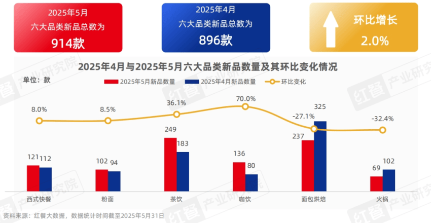 在新品數(shù)量方面,據(jù)紅餐產(chǎn)業(yè)研究院監(jiān)測(cè),2025年5月,西式快餐、粉面、茶飲、咖飲、面包烘焙、火鍋這六個(gè)品類的新品數(shù)量總共為914款,環(huán)比增幅為2%。