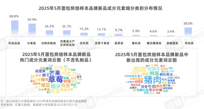 從熱門成分元素的詞云圖看,草莓、芒果等水果依舊是水果類中使用較多的成分元素。值得注意的是,豬肉、鴨蛋、牛肉、燒臘等特色成分元素在2025年首次被監(jiān)測(cè)到,主要是得益于端午粽子禮盒的上新。